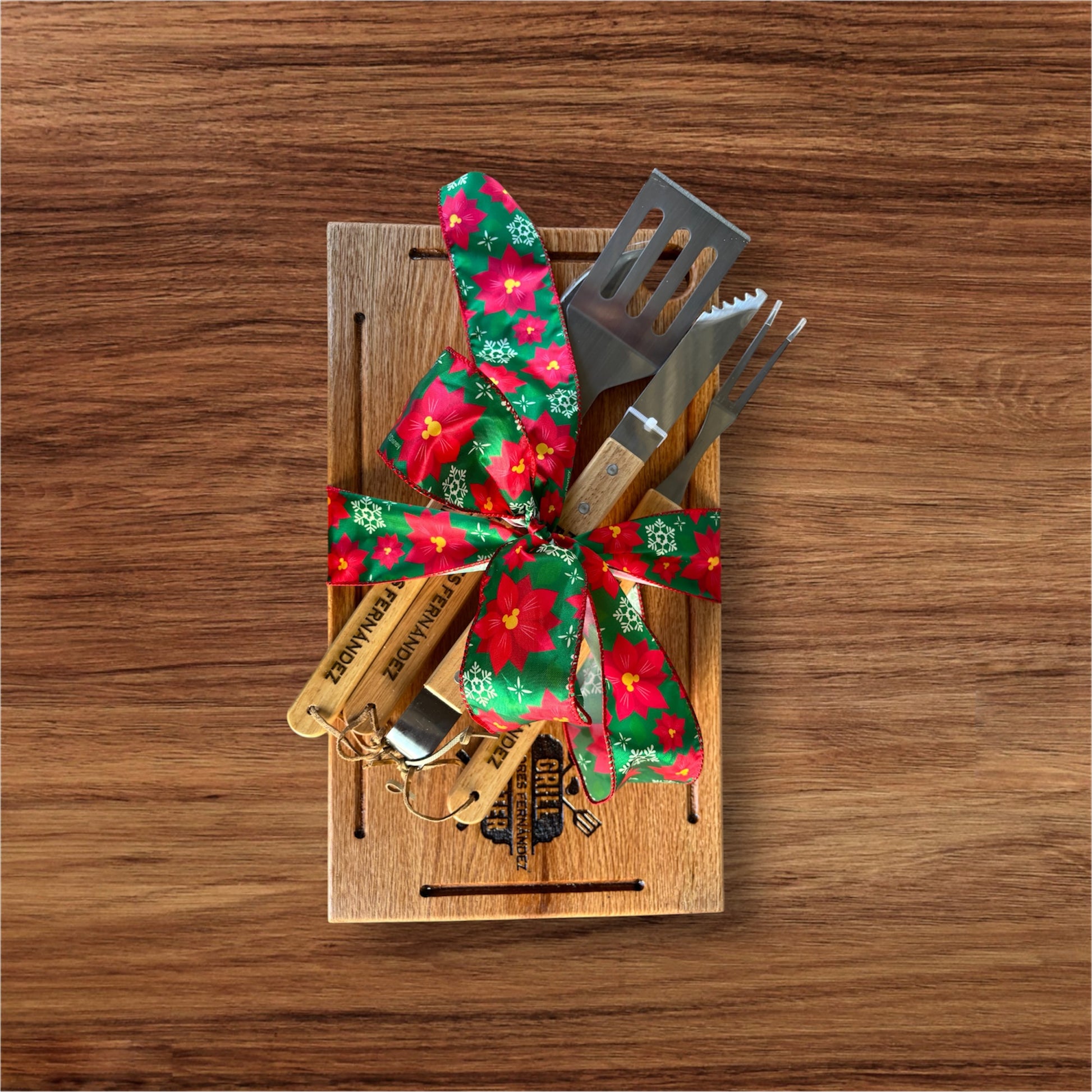 Paquete Tabla parrillera de encino 45x27 y 4 utensilios parrilleros todo personalizado y grabado en láser
